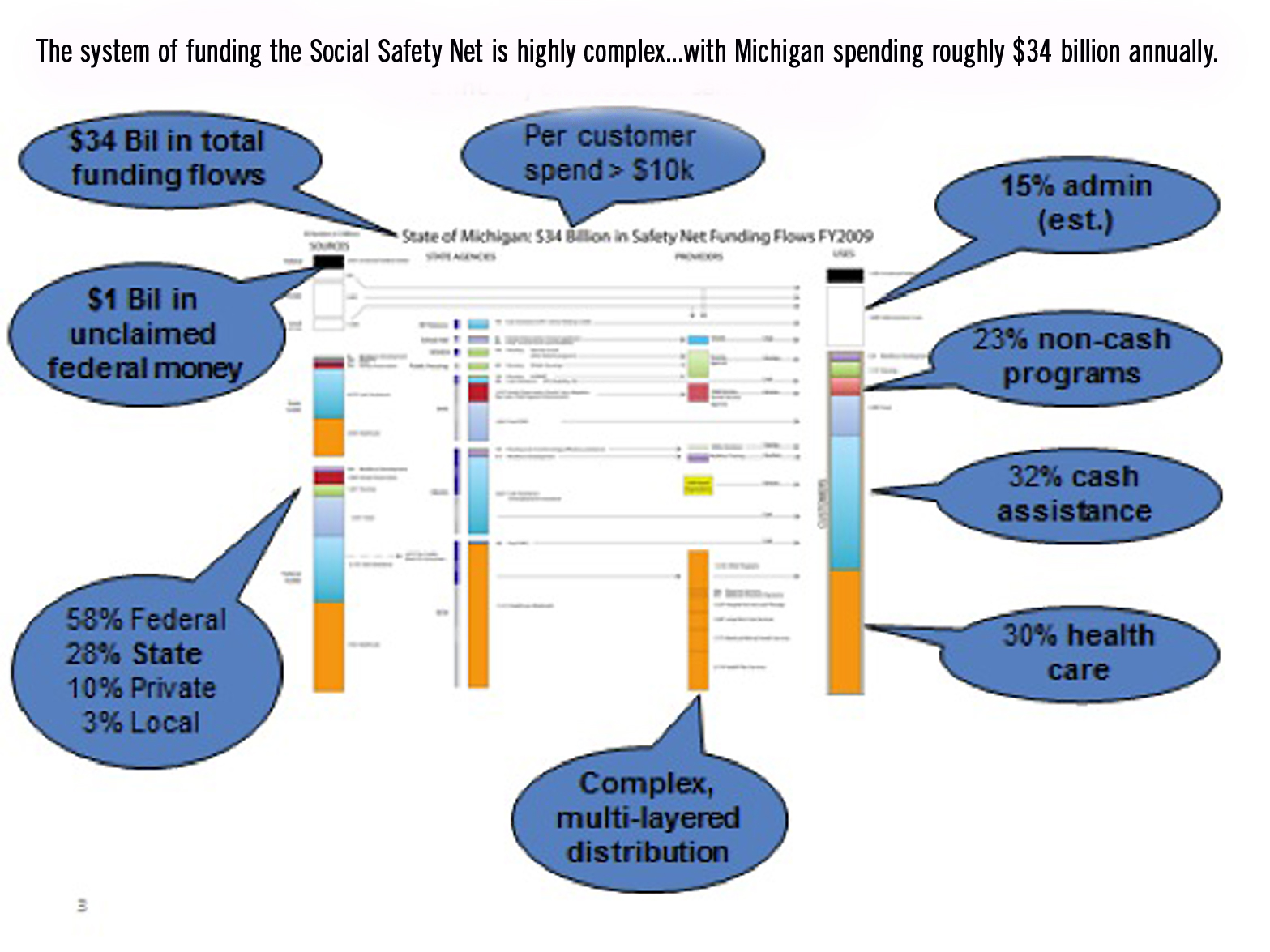 The graphic above illustrates the flow of $34 billion in the state of Michigan that is used by the government, non-profits and foundations to help individuals in the Safety Net. It leaves me frustrated. All are well-intentioned efforts, yet we aren’t making the progress on issues of hunger, health, shelter and a myriad of other basic human needs. Why?